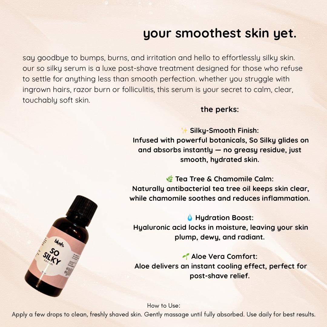 Say goodbye to bumps, burns, and irritation — and hello to effortlessly silky skin. Our So Silky Serum is a luxe post-shave treatment designed for those who refuse to settle for anything less than smooth perfection. Whether you struggle with ingrown hairs, razor burn, or folliculitis, this serum is your secret to calm, clear, touchably soft skin.